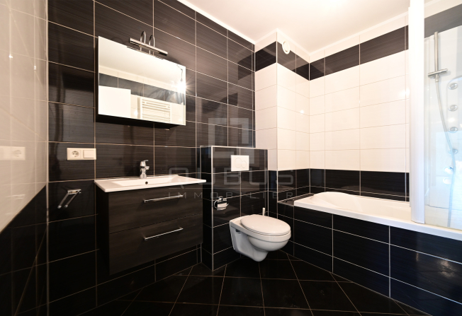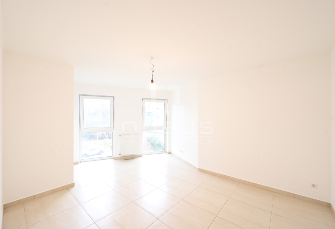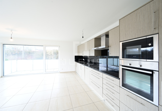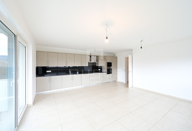 un hall d'entrée avec coin vestiaire, WC séparé, débarras, cuisine équipée ouverte, living/salle à manger donnant accès sur un balcon de 5,55m2, 3 chambres à coucher, salle de bains, cave privative, buanderie commune et deux emplacements de parking intérieur.