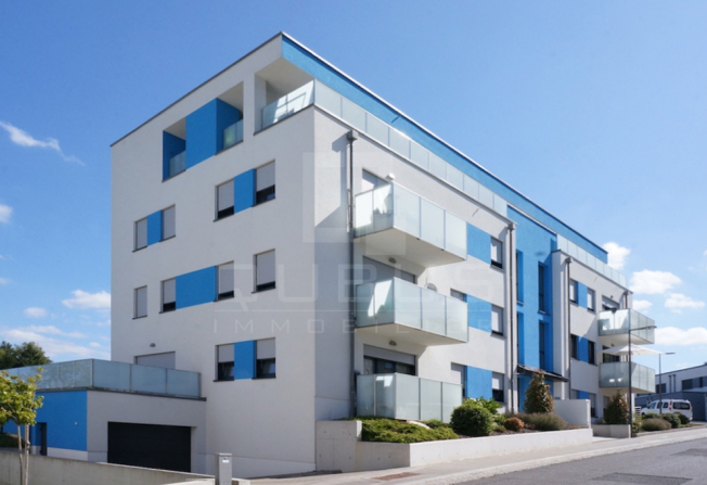 hall d'entrée, cuisine équipée ouverte, living/salle à manger donnant accès sur terrasse 19,90m2, jardin privatif de 7,90m2, 1 chambre à coucher, salle de douches, cave privative, buanderie commune et un emplacement de parking intérieur.