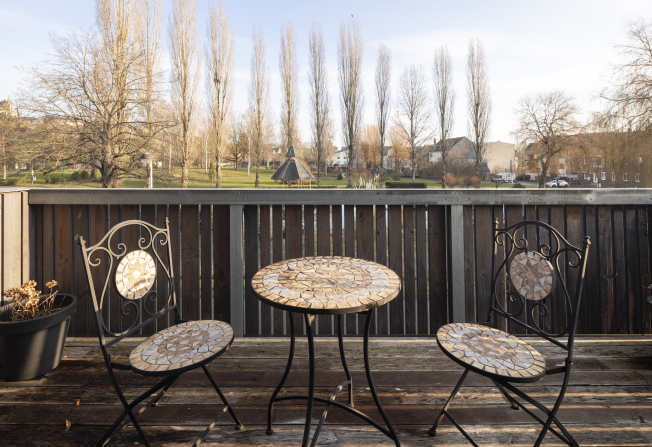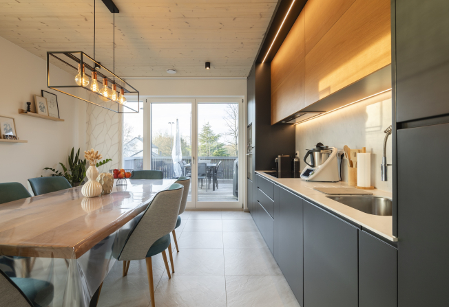 Hall d’entrée avec placards sur mesure, cuisine entièrement équipée ouverte sur la salle à manger avec accès à une grande terrasse et living donnant accès à une seconde terrasse offrant une vue dégagée sur le parc.