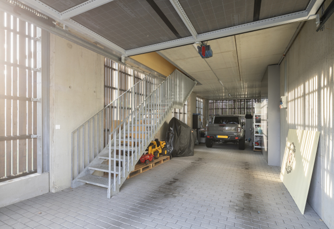 Garage spacieux pouvant accueillir 2 à 3 voitures, avec accès direct au jardin.