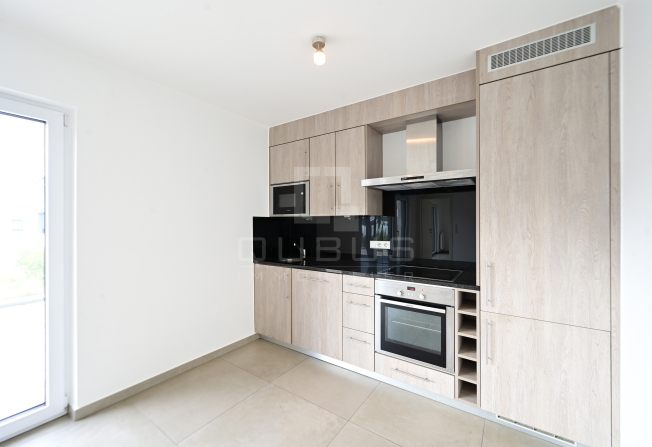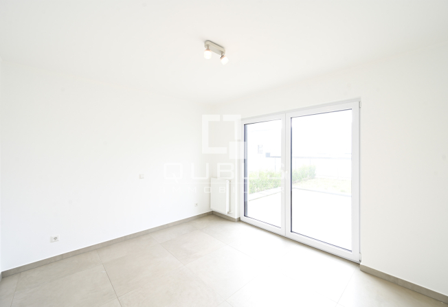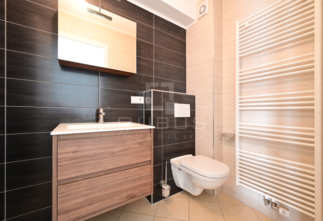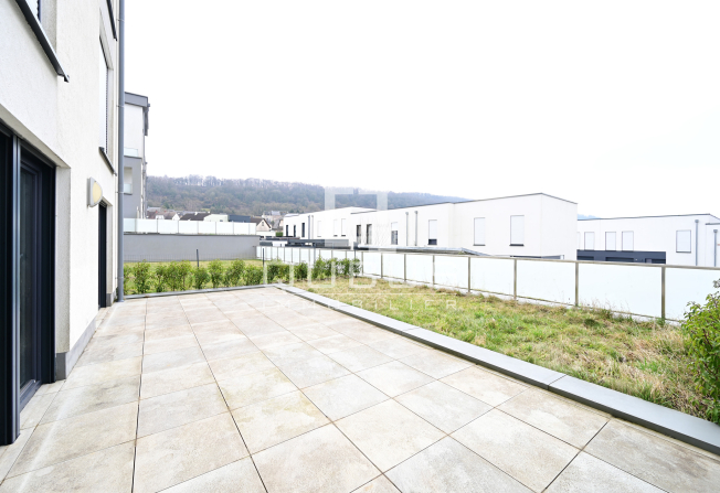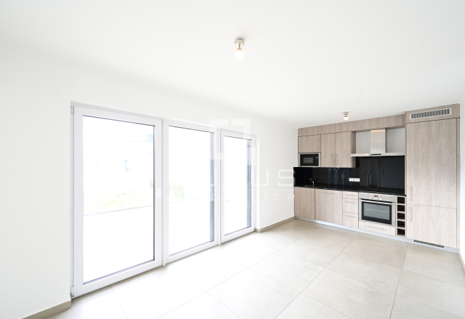 un hall d’entrée, cuisine équipée ouverte, living/salle à manger donnant accès sur terrasse de 34,34m2 et jardin privatif de 31,77m2, une chambre à coucher, salle de douches, cave privative, buanderie commune et un emplacement de parking intérieur.