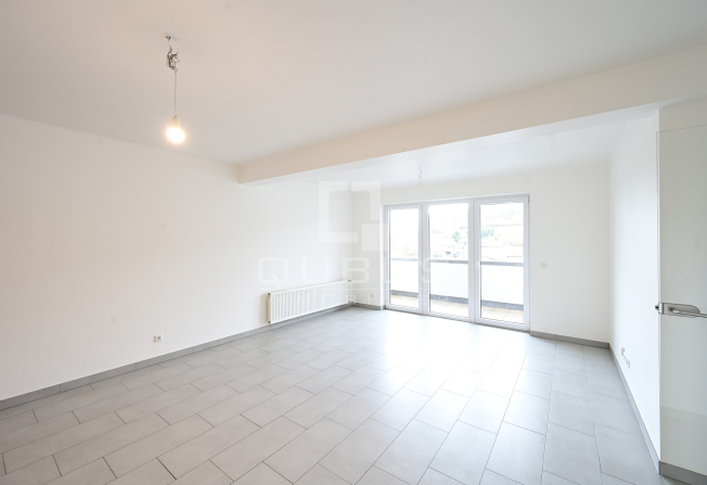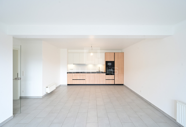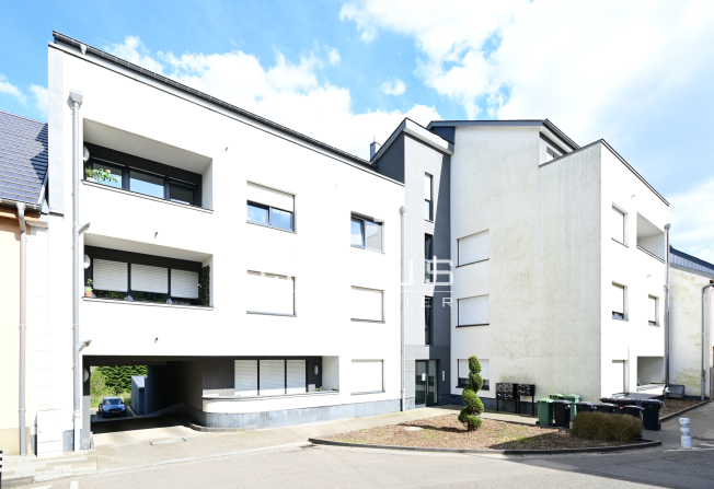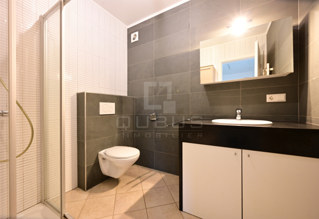 un hall d'entrée, WC séparé, nouvelle cuisine équipée ouverte, living/salle à manger, terrasse de 5,78m2, 2 chambres à coucher, salle de douches, cave privative, buanderie commune ainsi qu’un garage box pour une voiture.