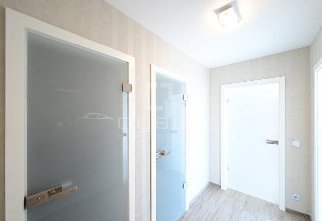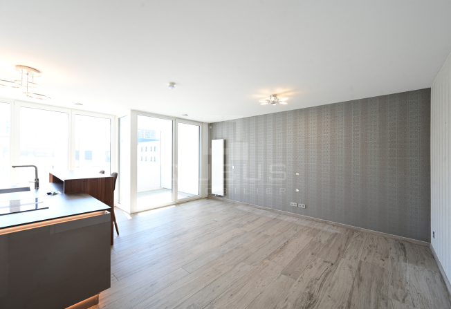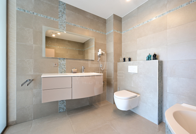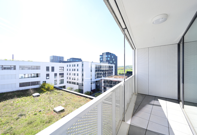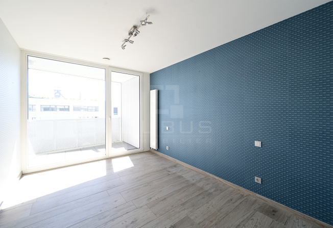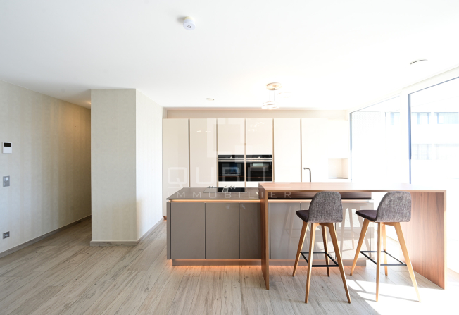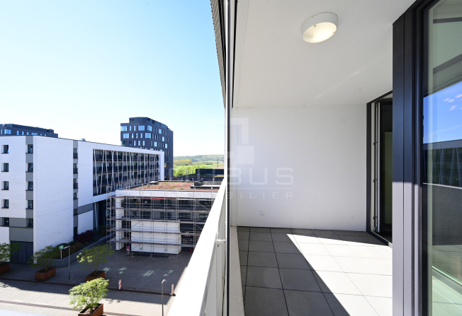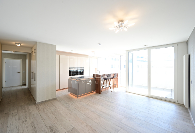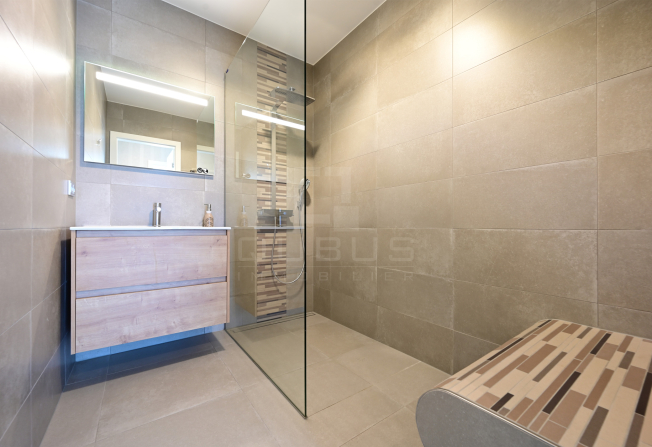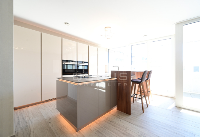 un hall d’entrée avec armoire sur mesure, une cuisine équipée ouverte, un living/salle à manger donnant accès à une loggia de 15 m², un hall de nuit, un WC séparé, une salle de douche, ainsi que deux spacieuses chambres à coucher, dont une avec salle de bains privative, toutes deux donnant accès à la même loggia.